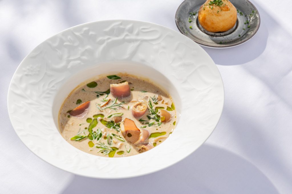 Вот лишь несколько штрихов этой гастрономической карты. Утонченное пастрами из утки, выдержанное в авторском маринаде, дополнено вяленой свеклой, воздушным кремом из творожного сыра и хрустящими лесными орехами. Ароматная похлебка из белых грибов с копченой уткой и трюфельным пончиком отсылает к детским воспоминаниям, при этом звучит свежо и современно.