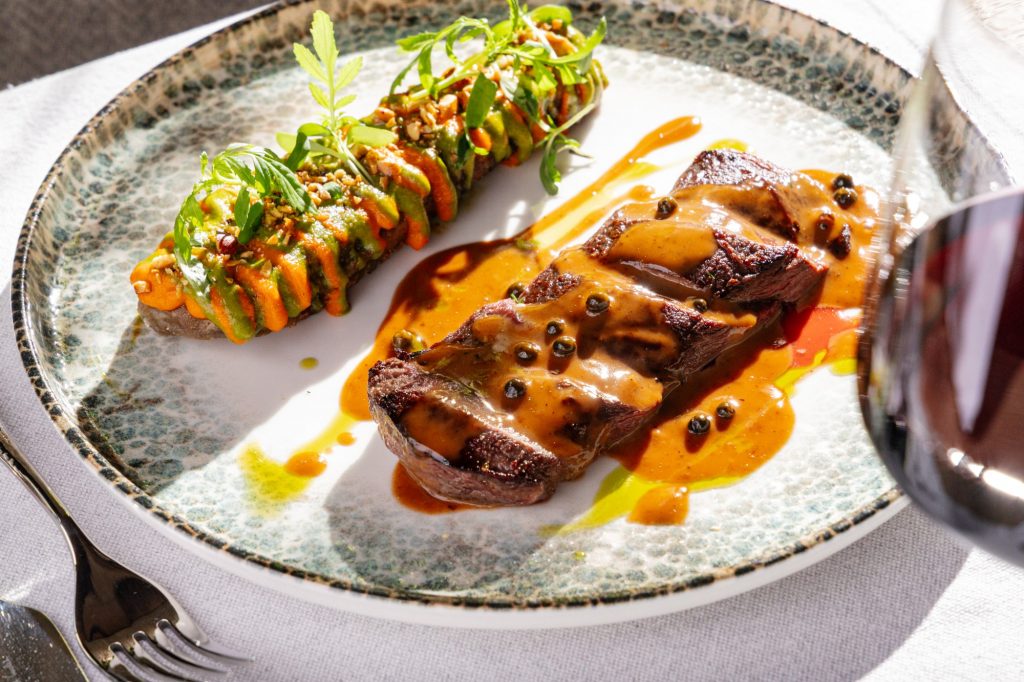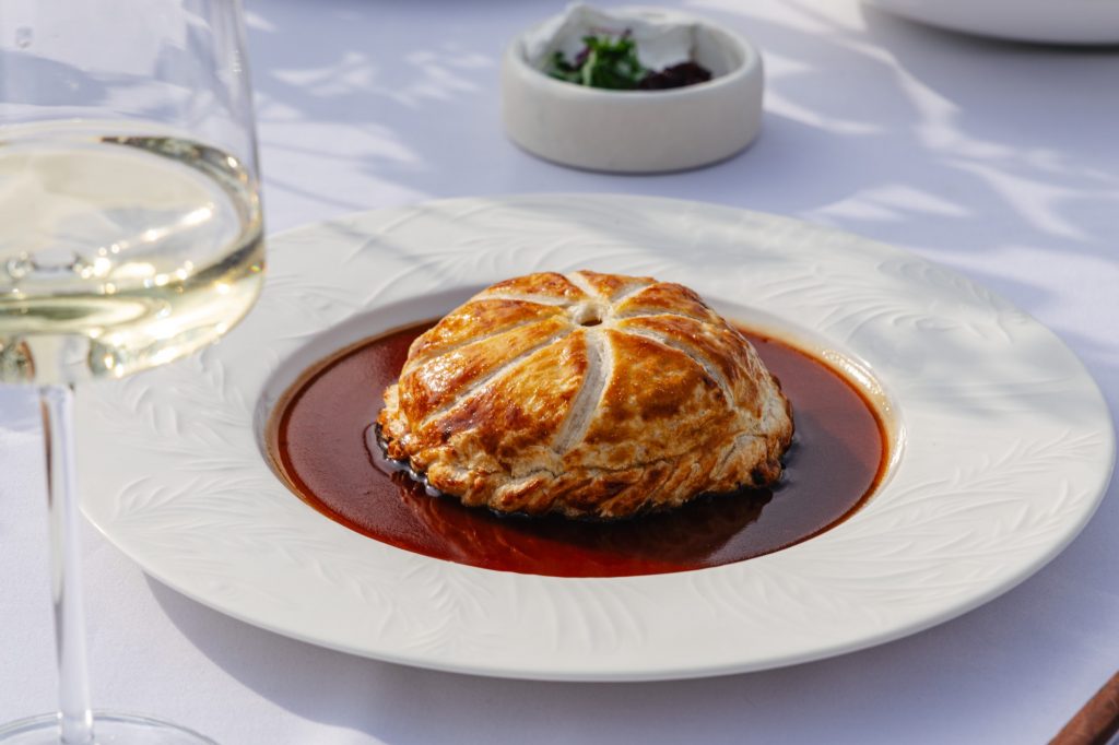 Корейка северного оленя, приготовленная в ароматных травах и поданная с перечным демиглясом и запеченным баклажаном, воплощает северную классику в эстетике haute cuisine. Не менее выразителен и слоеный рядовик с капустой и белыми грибами — современная интерпретация традиционного рецепта с тончайшими слоями теста, насыщенной грибной эмульсией и изысканным трюфельным акцентом.