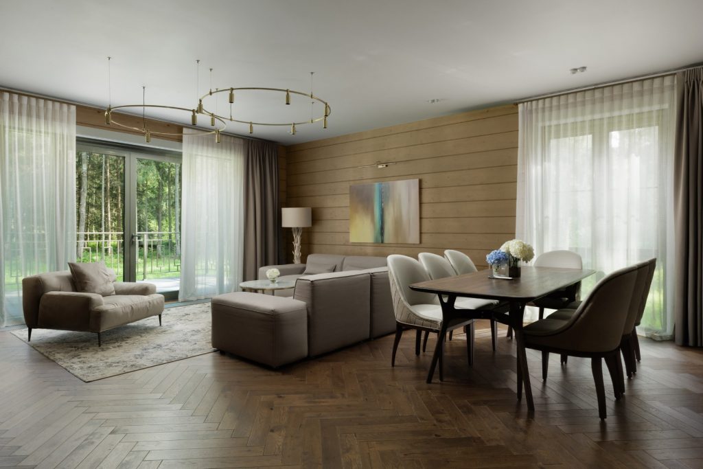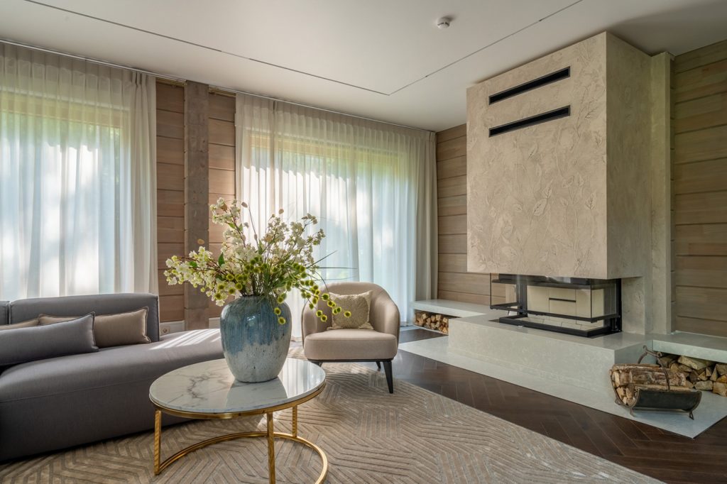 Пространства переходят одно в другое: от кухни с премиальной техникой и островом для легких завтраков к обеденной зоне с массивным столом и мягкими креслами, а далее к гостиной с камином, где приятно провести теплый вечер в кругу близких или насладиться уединением с хорошей книгой.