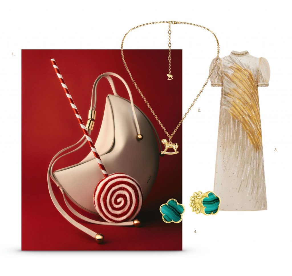 1. Сумка, Furla 2. Цепь с подвеской в виде лошадки из ювелирного сплава, Ulyana Sergeenko 3. Платье миди в стиле «ар-деко», THE NÁMES 4. Пусеты с малахитом из желтого золота, Chamovskikh