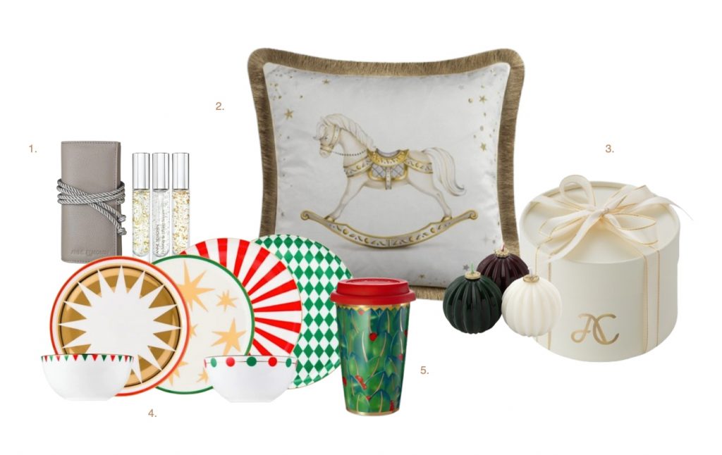 1. Укрепляющие и подтягивающие сыворотки с золотом 24K, Anne Semonin 2. Декоративная подушка Селестия, Togas 3. Набор свечей в виде цветных елочных шаров, Abrau Club by Cocos 4. Сервиз, Shirokov, Дом Фарфора 5. Фарфоровый термостакан, MY CERAMIC STORY, Золотое яблоко