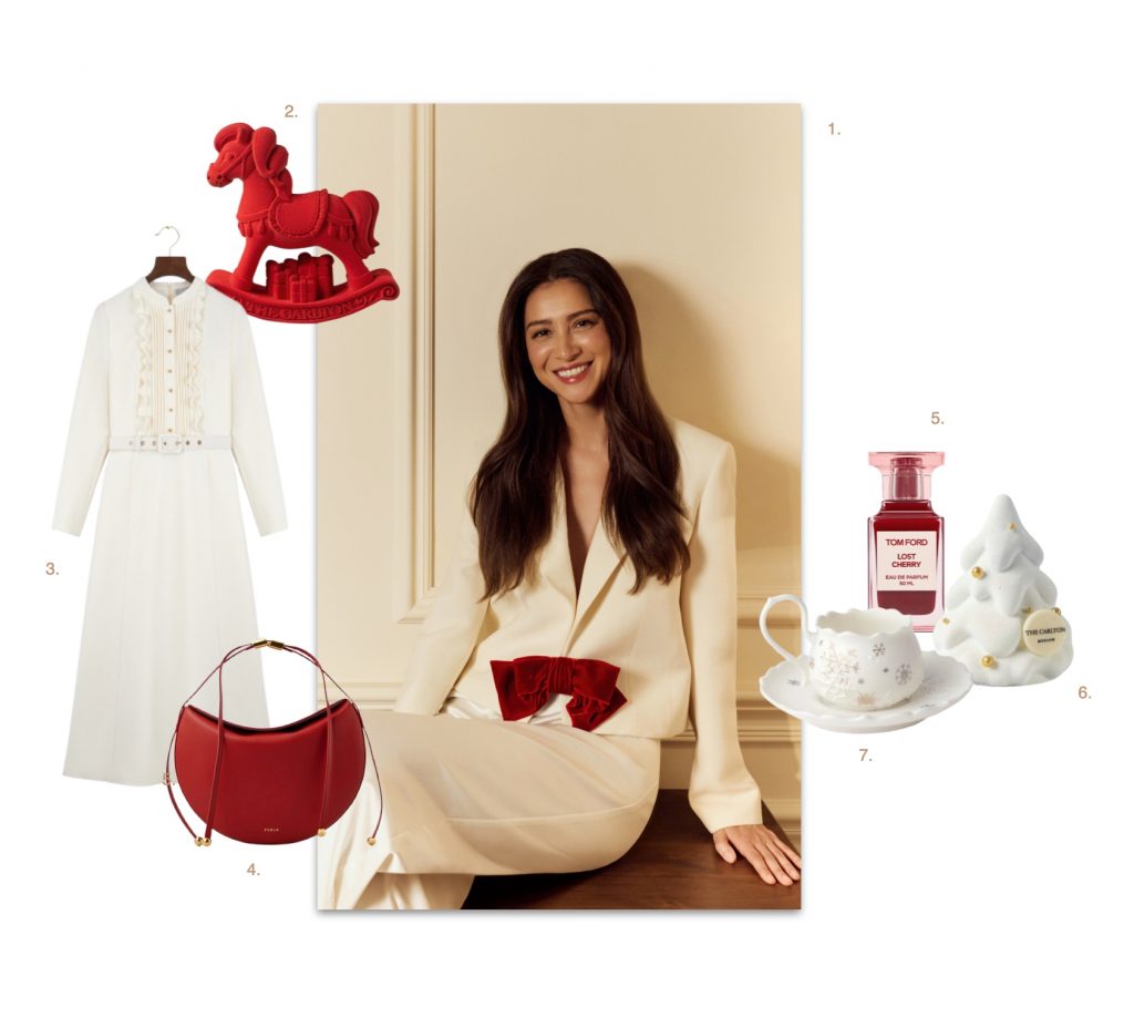 1. Новогодняя кампания OLOLOL с актрисой Равшаной Курковой 2. Десерт на заказ «Красный конь» в The Carlton, Moscow 3. Платье из вечерней коллекции OLOLOL 4. Сумка, Furla 5. Парфюмерная вода, Tom Ford, Золотое яблоко 6. Десерт на заказ «Petite White» в The Carlton, Moscow 7. Кофейная пара «Снежная», Дом «Евгения Крюкова»
