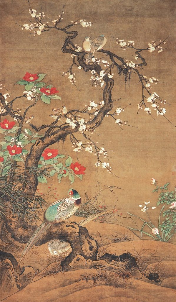 Люй Цзи. Свиток: золотистый фазан с камелиями. XV век. Цветная роспись по шелку