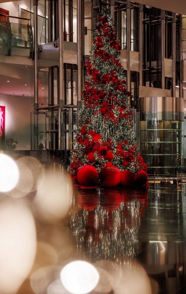 Центром этого сказочного оформления стала пятиметровая дизайнерская ель с игрушками ручной работы, а фирменные диффузоры и свечи Dr. Vranjes Firenze превращают пространство в полноценное сенсорное путешествие.