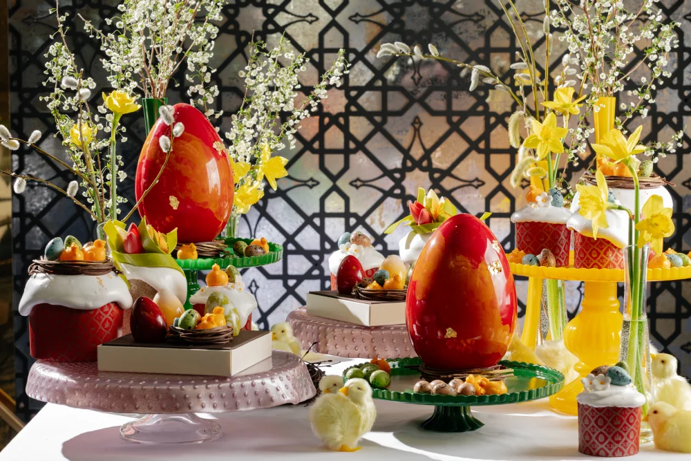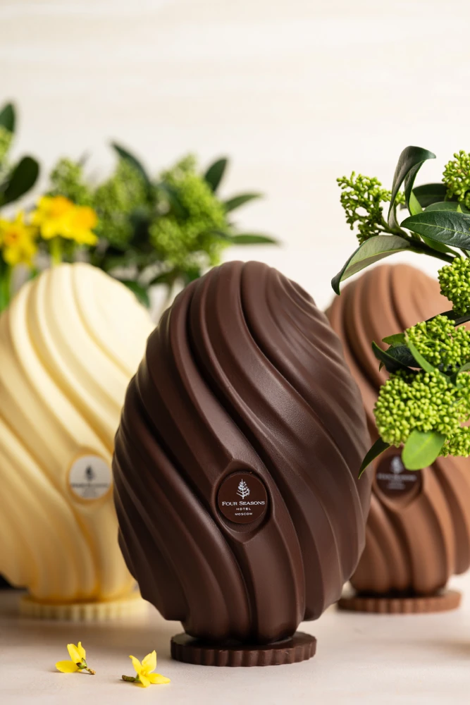 В отеле Stella di Mosca кондитерская La Cioccolateria представляет к Пасхе сезонную коллекцию сладостей и панеттоне: фигурки из белого шоколада в пудровых, карамельных и апельсиновых оттенках, а также декоративные яйца из темного и белого шоколада, украшенные миниатюрными ромашками. Эти десерты словно созданы для праздничного стола с почти кутюрным настроением — изысканные, тонкие и по-настоящему коллекционные. Ремесленный шоколад, ручная работа и деликатная весенняя эстетика складываются здесь в редкое сочетание, в котором гастрономия звучит как искусство.