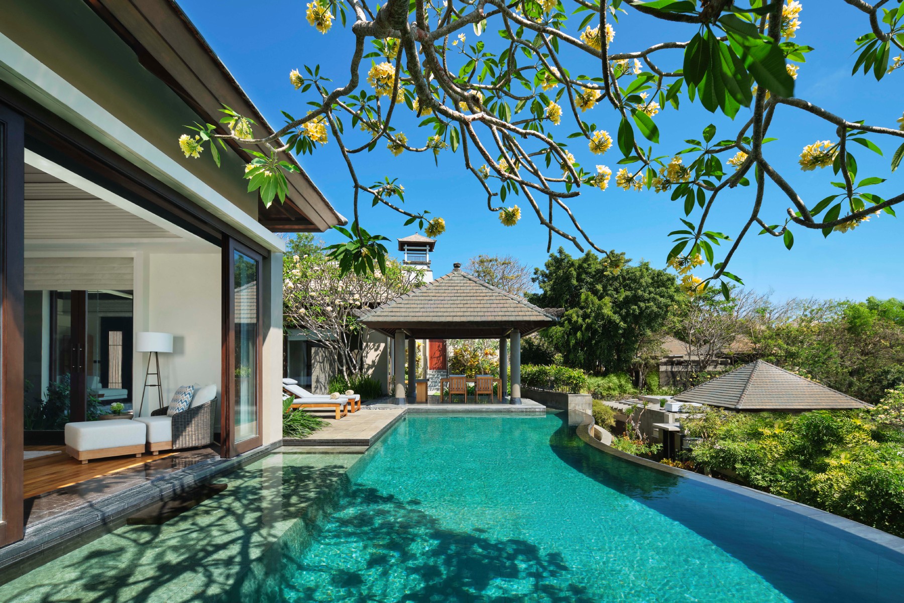 Биофильный дизайн усиливает связь с природой: зрелая тропическая зелень, натуральные материалы, панорамные виды на океан и продуманная планировка, вдохновленная ирригационной системой Subak, позволяют гостям полностью погрузиться в атмосферу острова на каждой вилле. Прогулочные тропы среди зелени создают эффект открытия и стимулируют выработку дофамина, павильоны для йоги способствуют высвобождению эндорфинов, а общественные пространства — от ресторанов до бассейна — формируют условия для живого общения, усиливая чувство связи и гармонии через выработку окситоцина.