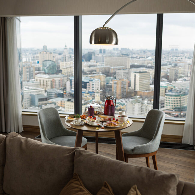 Проводите ли вы время наедине с собой или в кругу близких людей, в отеле вас ждет эстетика интерьеров, выполненных в скандинавском стиле, завораживающие виды столицы, исключительный сервис и великолепное пятизвездочное меню, разработанное специально для подачи в номер.